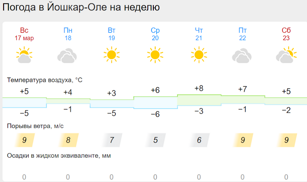 В Йошкар-Оле температура воздуха ближе к концу недели поднимется до +8 градусов. Самым прохладным днем станет вторник, в который ожидается всего лишь +3 градуса.