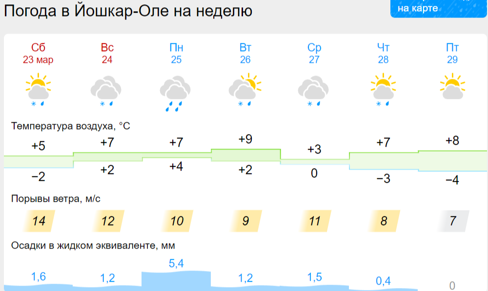 В Волжске в понедельник столбик термометра поднимется до +10 градусов, как и в Звенигове. В Козьмодемьянске почти всю неделю будет светить солнце. Во всех городах ожидаются дождевые осадки. Напомним, что с 1 апреля родители будущих первоклассников Марий Эл могут подавать заявление на зачисление в школу .