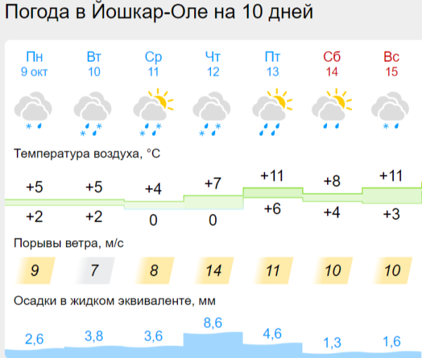 В Йошкар-Оле температура воздуха в середине недели максимально снизится до 4 градусов. Днем в пятницу и воскресенье ожидается повышение температуры до 11 градусов, однако из-за снега и дождей воздух может казаться холоднее.