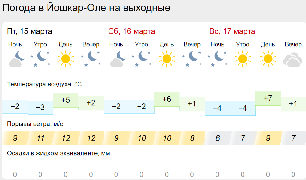 В Волжске столбик термометра в оба выходных дня покажет +4 градуса. Козьмодемьянск и Звенигово порадуют горожан +5 градусами тепла. Во всех городах жителей поприветствует солнышко, а осадки в эти выходные решили не проходить.